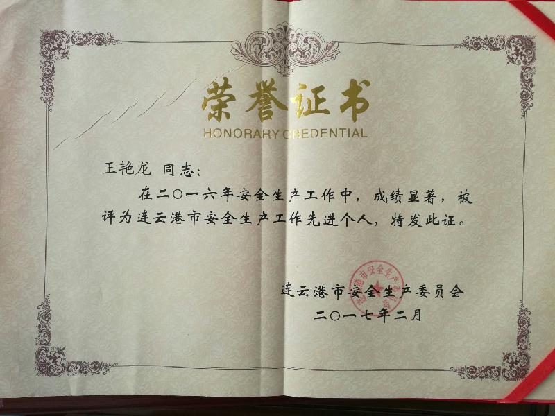 近日,从市安全生产委员会办公室传来好消息,bet365手机网址多少在2016年度全市安全生产目标管理考核中被评为“优秀”等次,荣获连云港市2016年度安全生产目标管理“优秀单位”荣誉称号,这也是bet365手机网址多少连续两年获得该荣誉,王艳龙同志被评为全市安全生产先进个人。