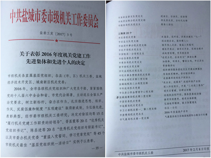 近日,盐城市委市级机关工委召开表彰大会,表彰2016年度机关党建工作先进集体和先进个人,盐城海事局机关二支部“巡航执法创平安,服务发展在沿海”活动荣获2016年度市级机关最佳“基层党组织统一活动日”实例三等奖。