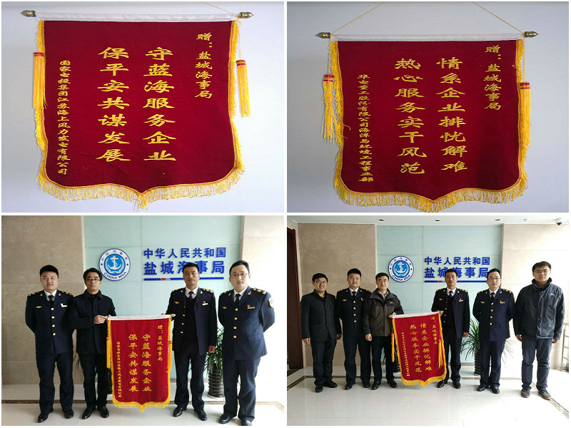 2月23日上午,国家电投集团江苏海上风力发电有限公司陈立志副总经理、华电重工滨海海上风电项目部刘玉飞经理一行将两面写有“守蓝海服务企业、保平安共谋发展”“情系企业排忧解难、热心服务实干风范”的锦旗送至盐城海事局指挥中心,以感谢该局长期以来为国家电投滨海海上风电项目提供的优质服务。