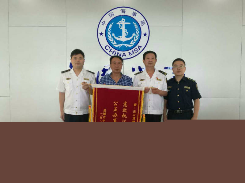 6月12日下午,盐城市中川运输有限公司向赣榆海事处赠送了一面写有“高效执法权为民用,公正办事 利为民谋”的锦旗,表达对赣榆处高效执法公正办事的赞誉和感激之情。